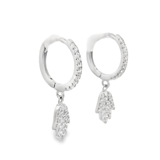 Silver Hamsa Dangle Huggie Hoop Earrings with Pavé Zirconia
